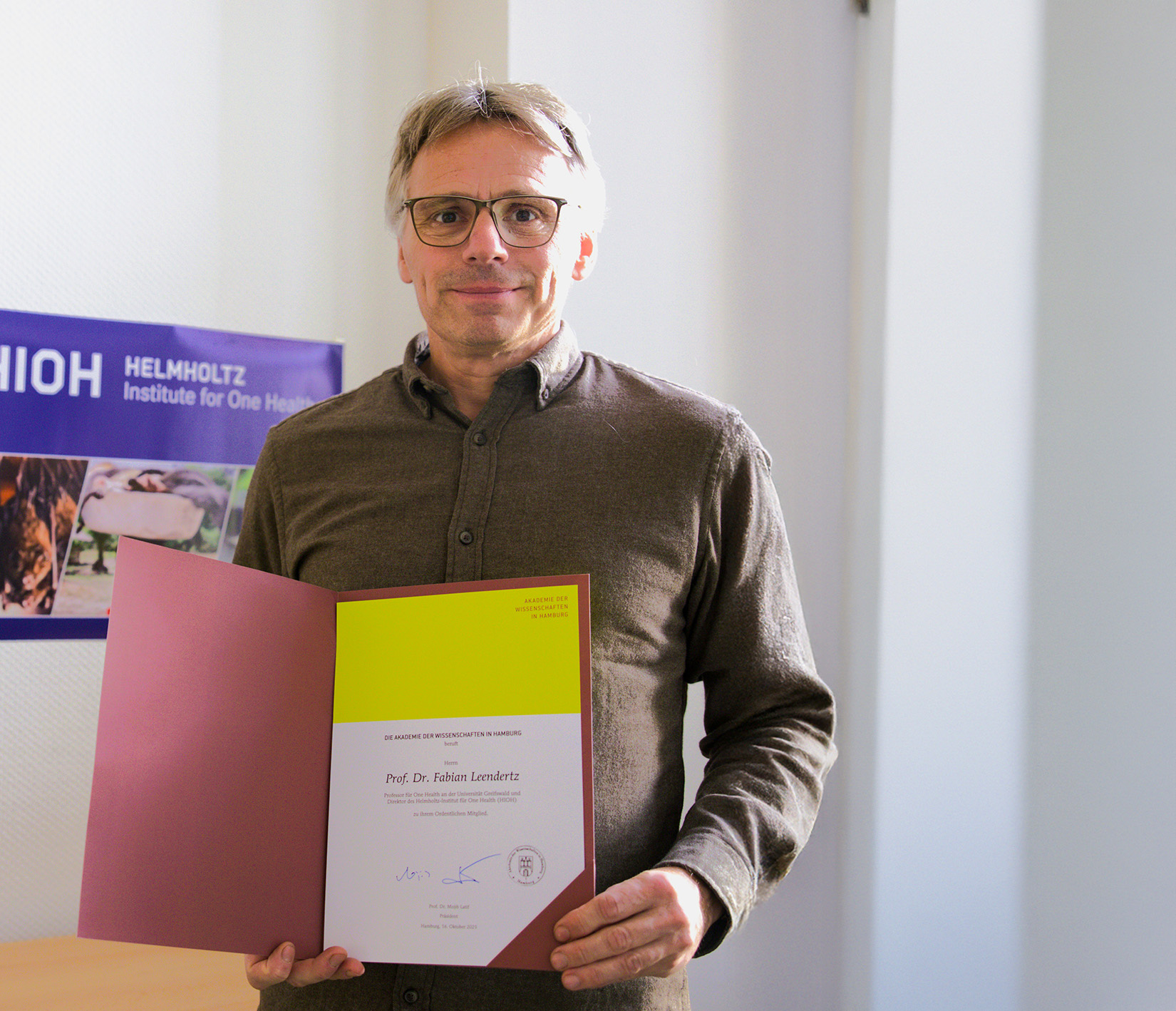 During the 20th anniversary celebrations of the Academy of Sciences in Hamburg , Fabian Leendertz, founding director of the Helmholtz Institute for One Health (HIOH), was inducted as a full member. The ceremony took place on 16 October 2025 in Hamburg. Five new members joined the interdisciplinary network, which currently comprises 145 leading scientists from northern Germany.