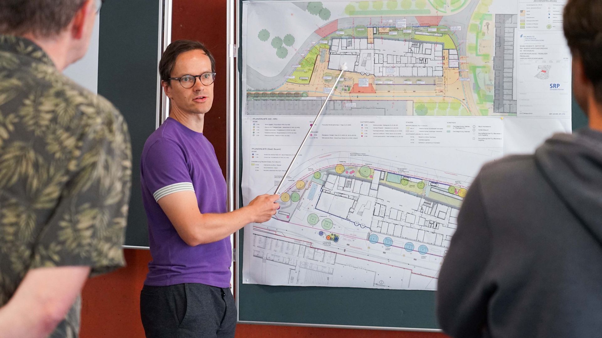 Tobias Kerrinnes, Leiter Wissenschaftliche Infrastruktur am HIRI, präsentierte die geplante Bepflanzung der Außenanlage. Das vorgestellte Konzept setzt auf robuste, allergikerfreundliche Pflanzen und lässt sich zudem von der heimischen Natur und ihren Materialien inspirieren.
