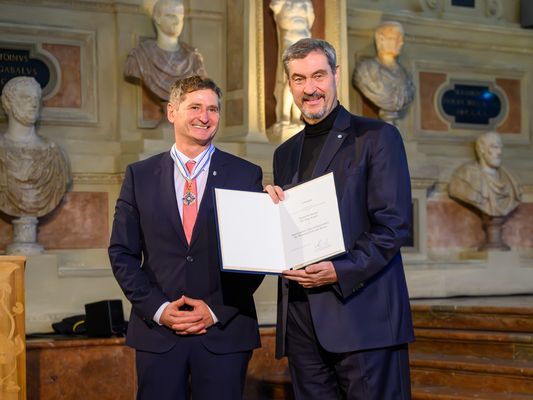 Es gibt nicht mehr als 100 lebende Träger:innen des Maximiliansordens, und alle eint, dass sie sich mit exzellenten Leistungen in der Wissenschaft oder der Kunst in herausragender Weise um Bayern verdient gemacht haben. Seit heute ist Jörg Vogel, Direktor des Helmholtz-Instituts für RNA-basierte Infektionsforschung (HIRI) und Professor an der Julius-Maximilians-Universität Würzburg (JMU), Mitglied dieser Ordensgemeinschaft. Neben acht weiteren geehrten Persönlichkeiten erhielt der Wissenschaftler die Auszeichnung bei einem Festakt im Antiquarium der Münchener Residenz aus den Händen des Bayerischen Ministerpräsidenten Markus Söder.