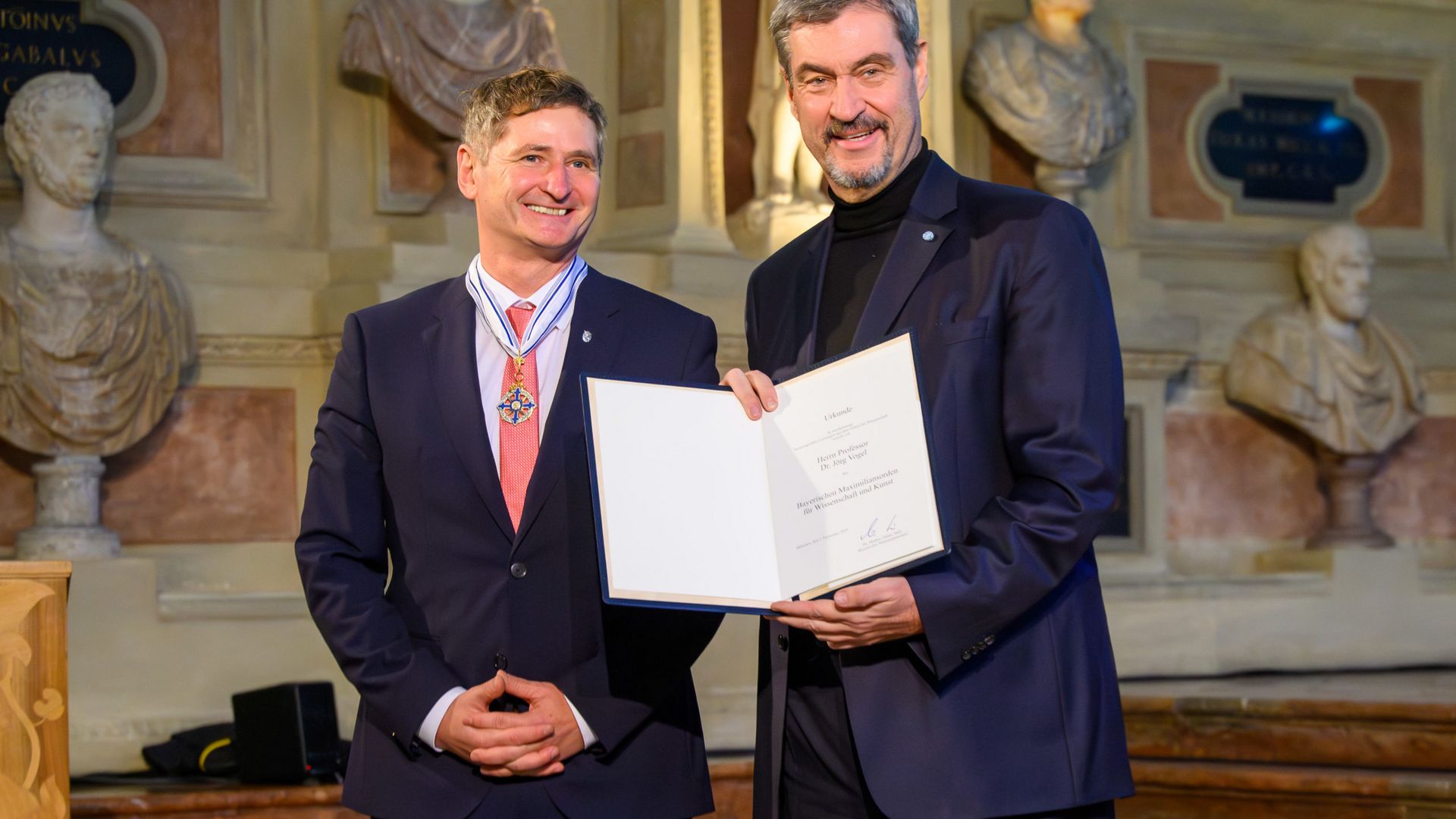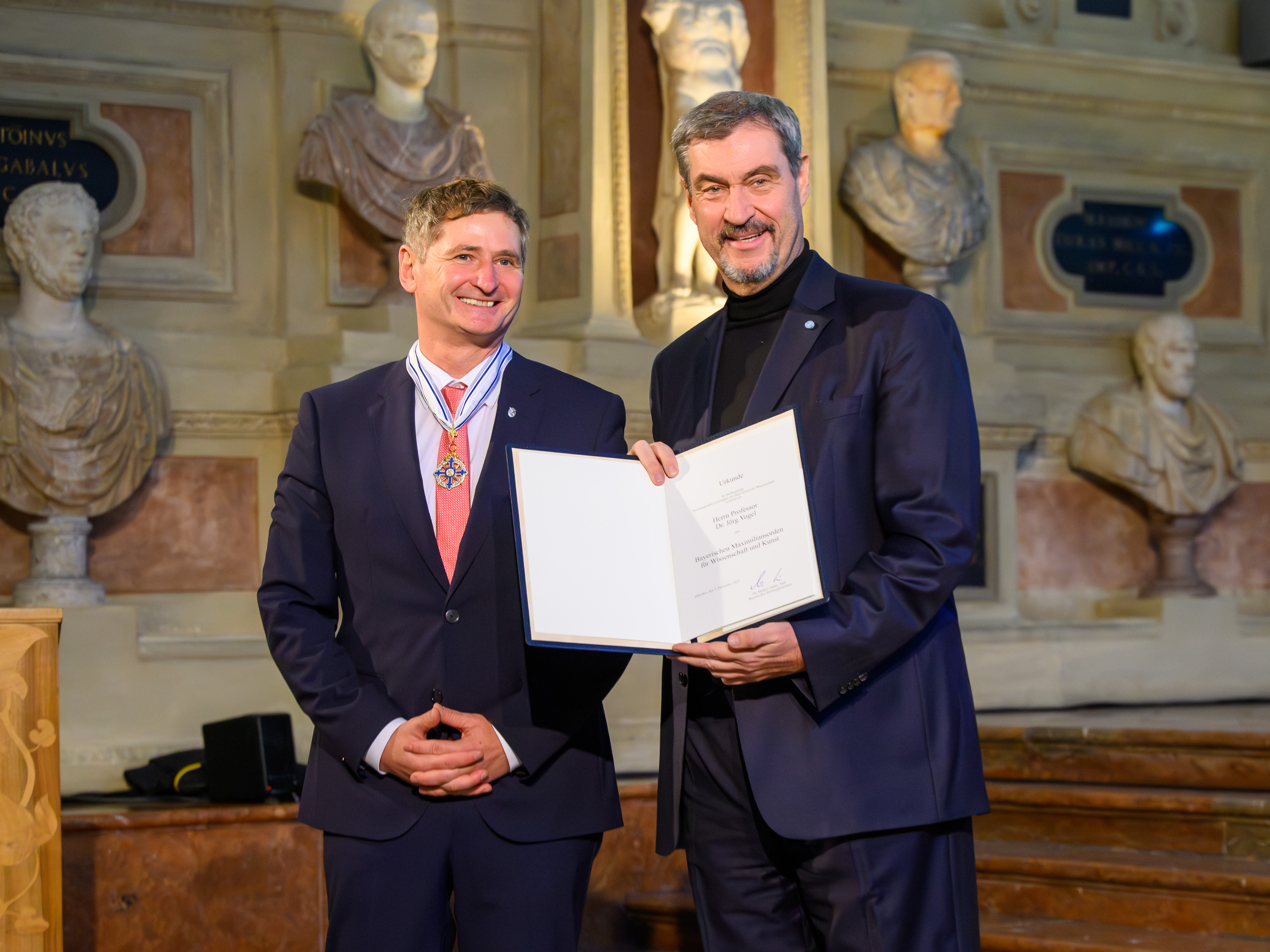Würzburg/München, 3. Dezember 2025 – Bei einem Festakt im Antiquarium der Münchner Residenz ist Jörg Vogel, Direktor des Helmholtz-Instituts Würzburg, am heutigen 3. Dezember mit dem Maximiliansorden für Wissenschaft und Kunst gewürdigt worden. Er nahm die Ehrung aus den Händen des Bayerischen Ministerpräsidenten Markus Söder entgegen, der die höchste Auszeichnung des Freistaats auch als den „Bayerischen Nobelpreis“ bezeichnete.