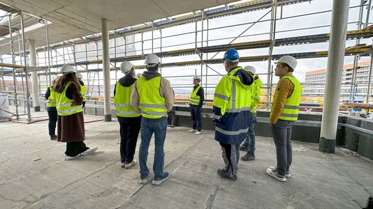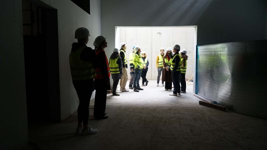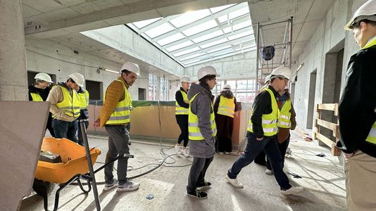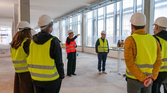 The roofing ceremony on September 24 was a huge success. More than 200 guests from science, politics, ministries, public authorities, and the media gathered to celebrate another milestone in the construction of the new building for the Helmholtz Institute Würzburg (HIRI). To show gratitude for the helpers' active support, the institute organized an exclusive tour of the new building. Britta Grigull, the institute's Head of Administration, Tobias Kerrinnes, Head of Scientific Infrastructure, and Sebastian Stockmann, Building and Operational Technology Officer, provided exciting insights into the future premises.
